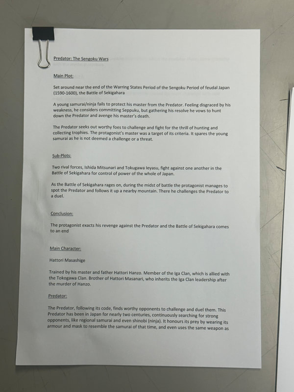 This page serves as the start of the prologue of the manga, introducing a war in the time period of feudal Japan. Quite like how my front cover depicts the Predator standing in a field of swords, symbolising the victims of the creature, I want the page to show a similar feeling.
