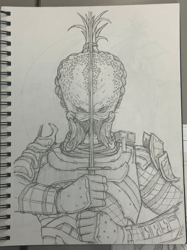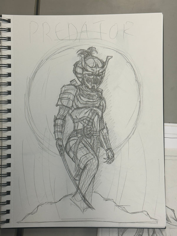 While I had a general rough idea of how to present the Predator on the front cover, it was actually making it look mysterious and threatening that was the issue. I had included details in the last three drawings, which would ultimately be wiped out by the darkness I intended to shroud it in. While the second to last drawing was the one I originally wanted to go for, it still showed too much of the Predator so I opted to go for the last drawing as that had more of a chance to be kept mysterious but threatening at the same time.