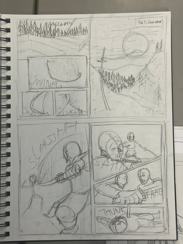 This page's purpose is to establish a fight is happening between two conflicting sides. The panels I have decided to be more impactful, leaving the opportunity to use onomatopoeia to blend with the action of the swords slashing, colliding and a gun firing.
