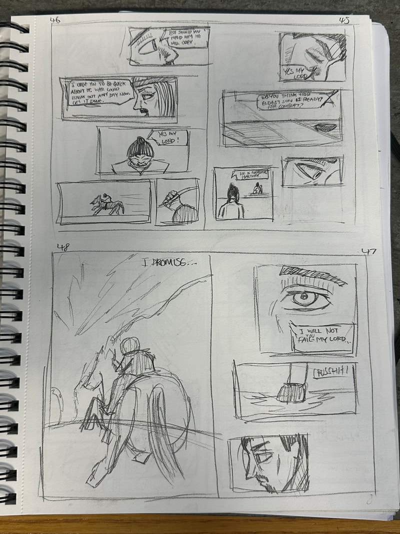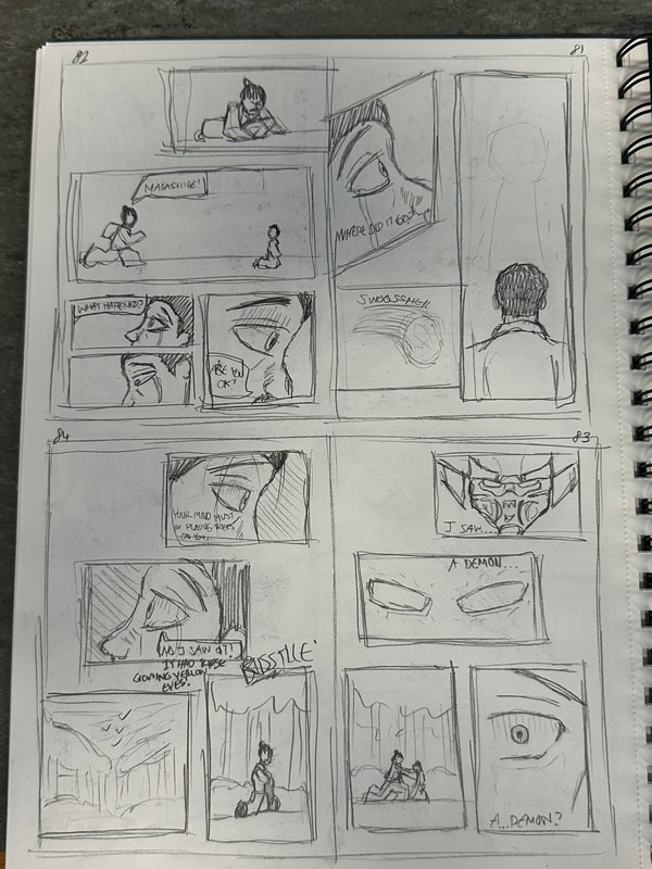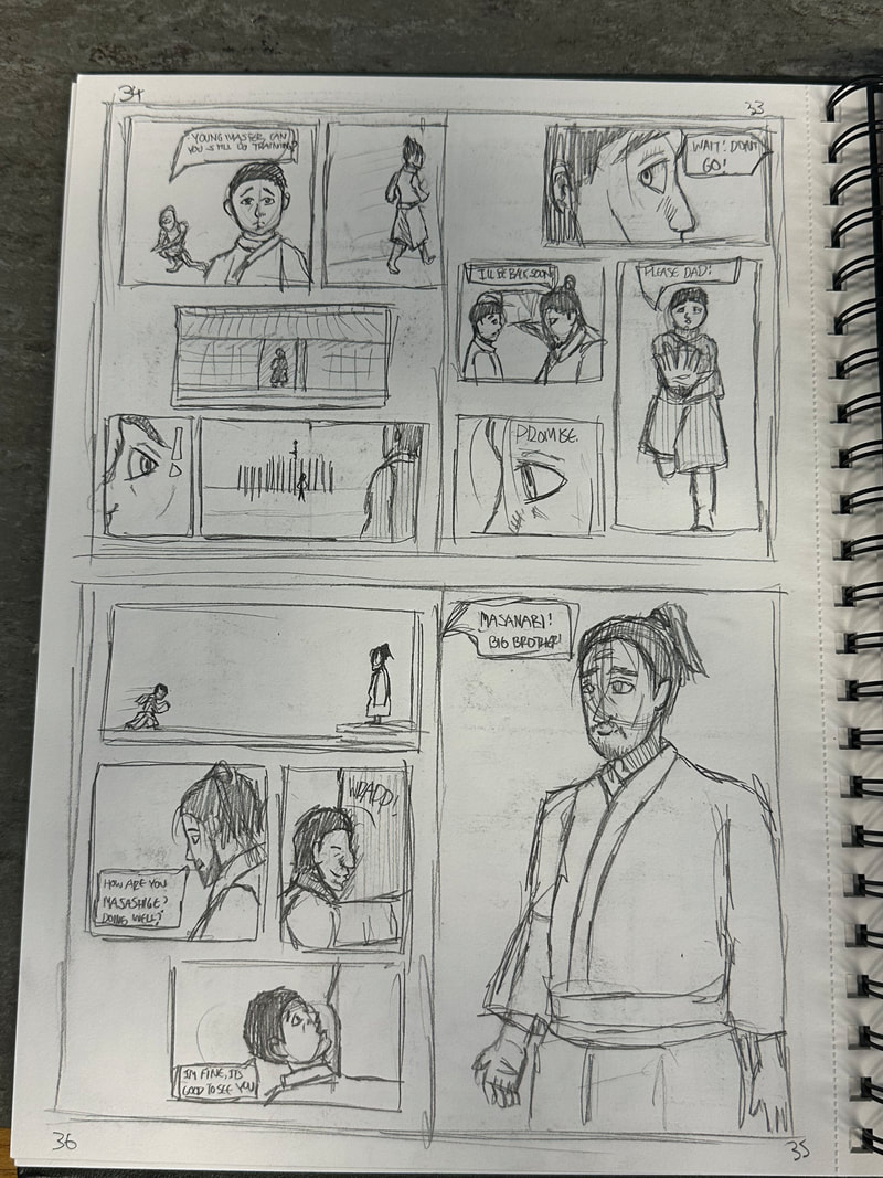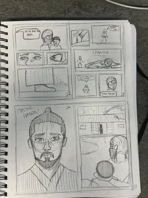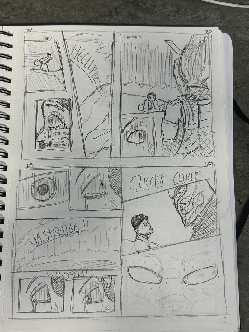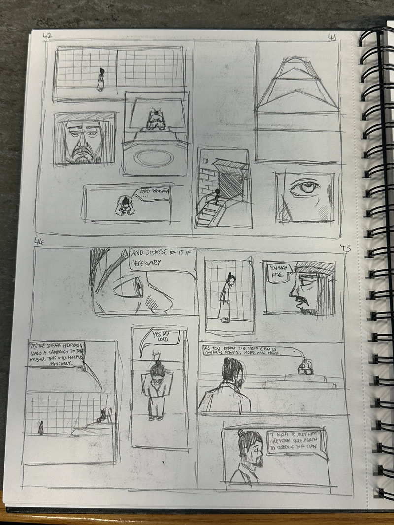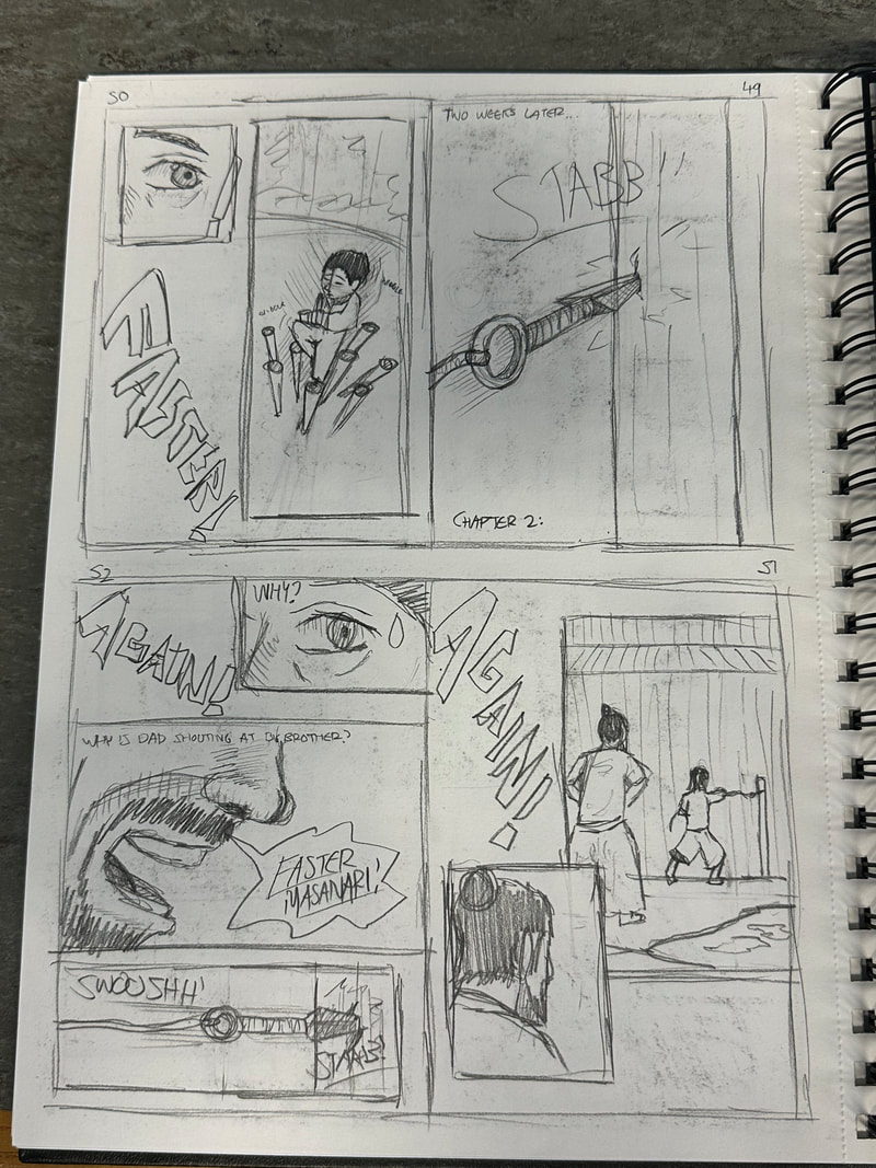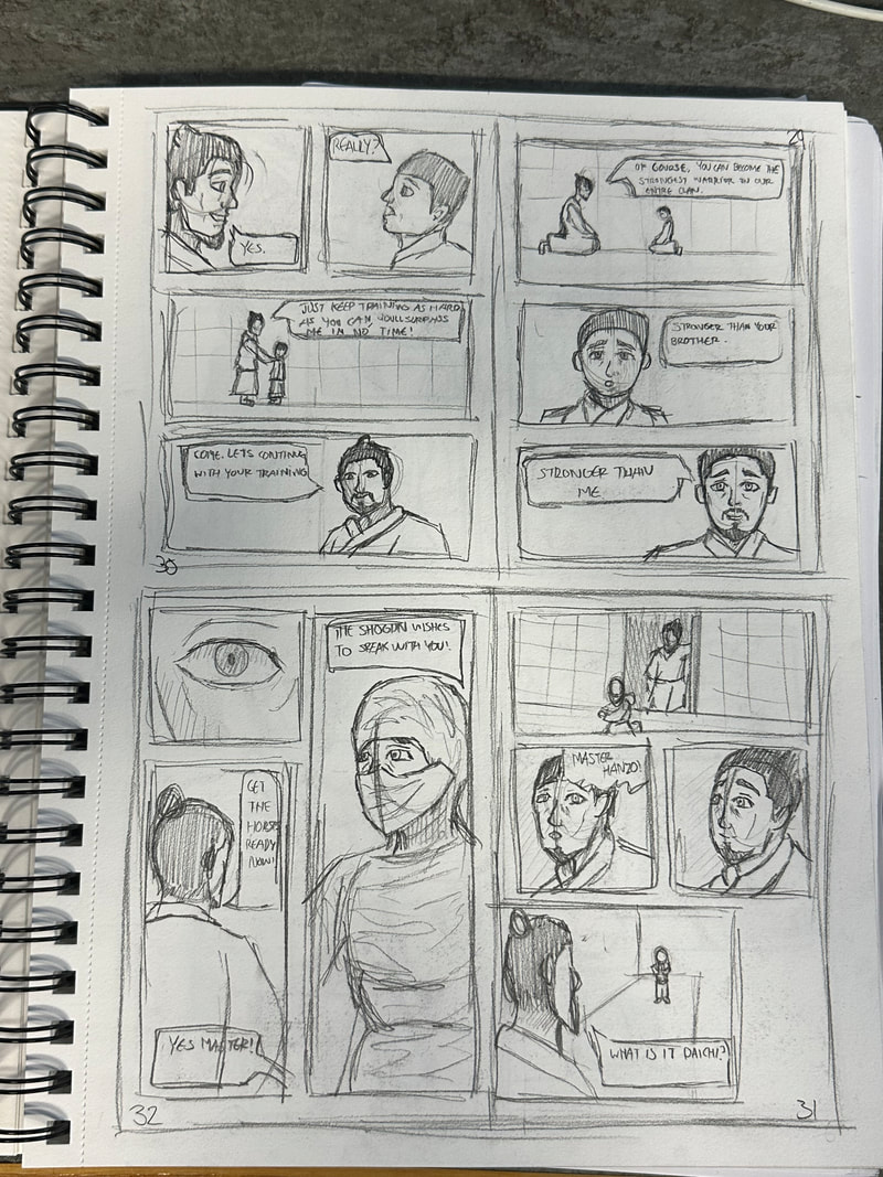 These are the first few pages for the introduction of my manga. They are roughly drawn to get a rough idea of how I want the pages spread out, how the panels are laid out and how the scenes and characters are depicted. My aim is to have all the pages depicted in black and white, inspired by both manga and Kurosawa's black and white media.