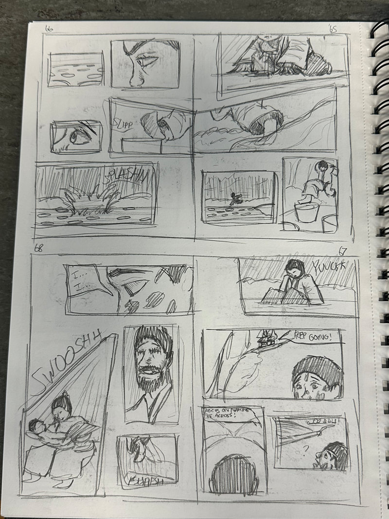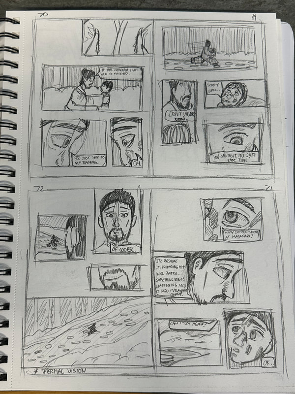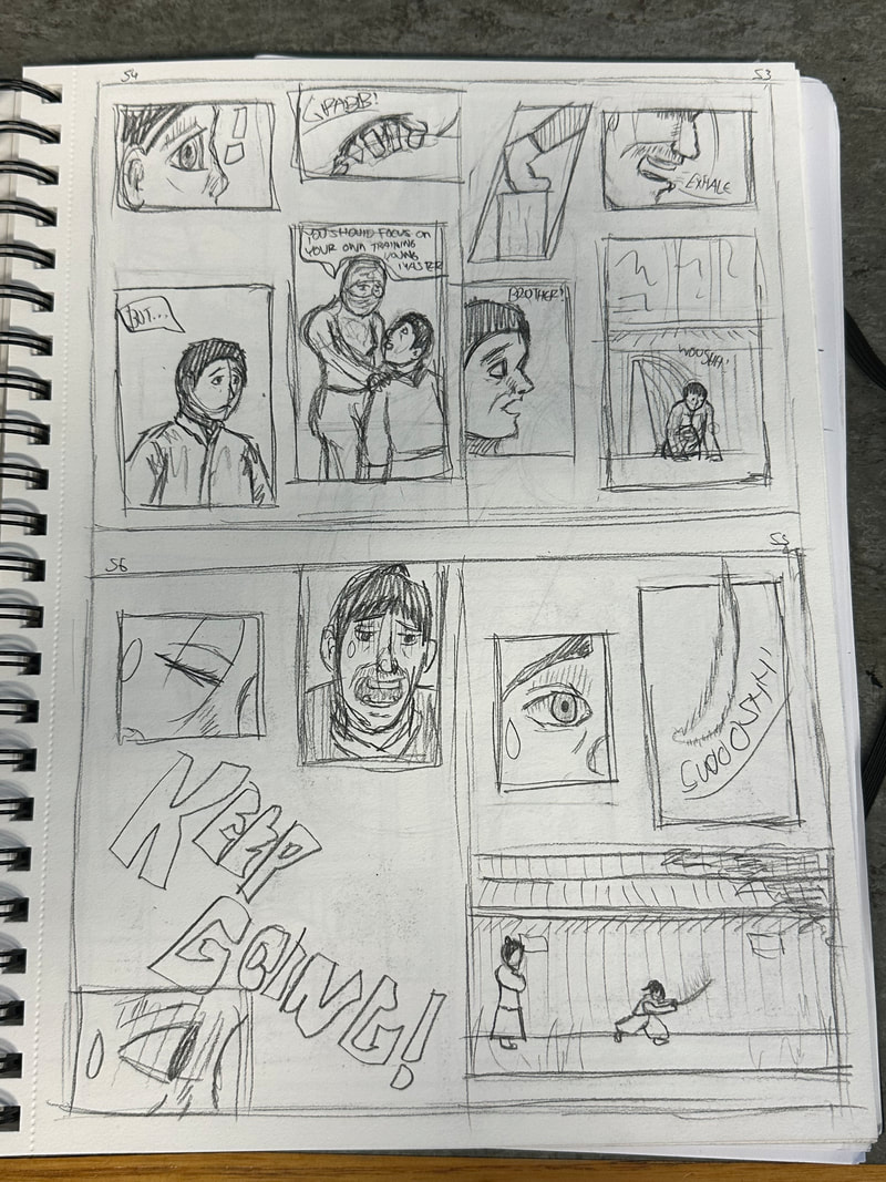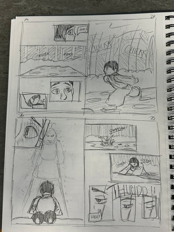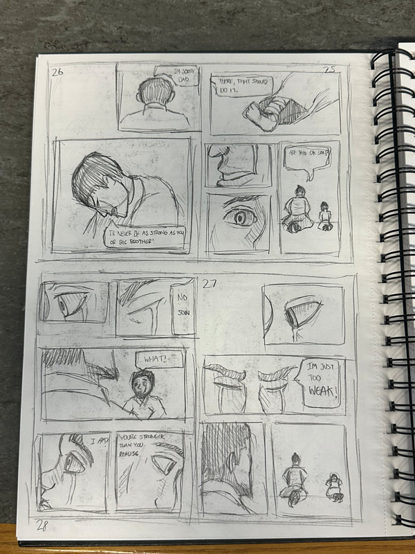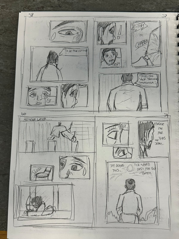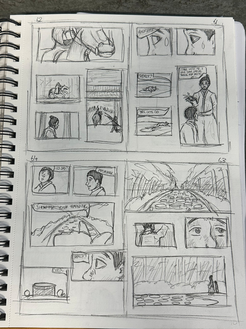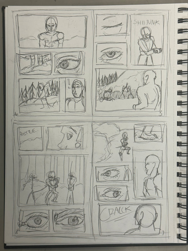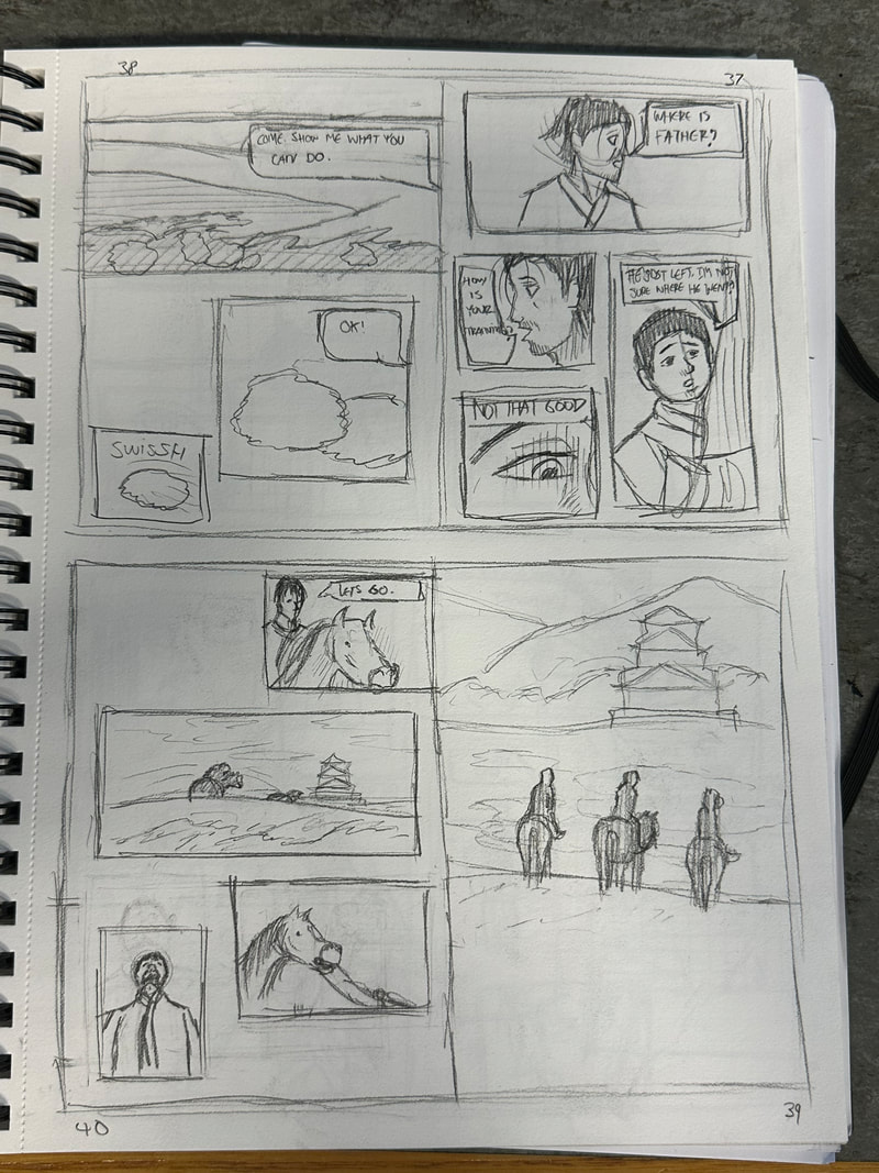 These are the first few pages for the introduction of my manga. They are roughly drawn to get a rough idea of how I want the pages spread out, how the panels are laid out and how the scenes and characters are depicted. My aim is to have all the pages depicted in black and white, inspired by both manga and Kurosawa's black and white media.