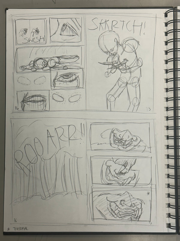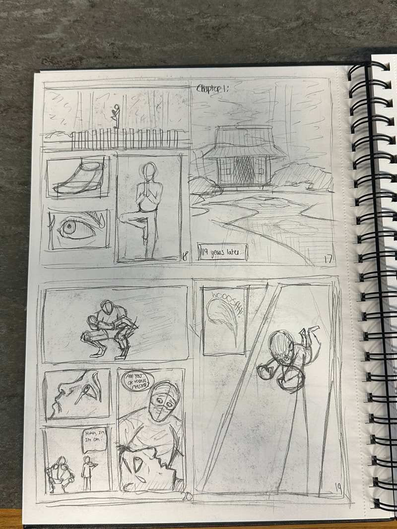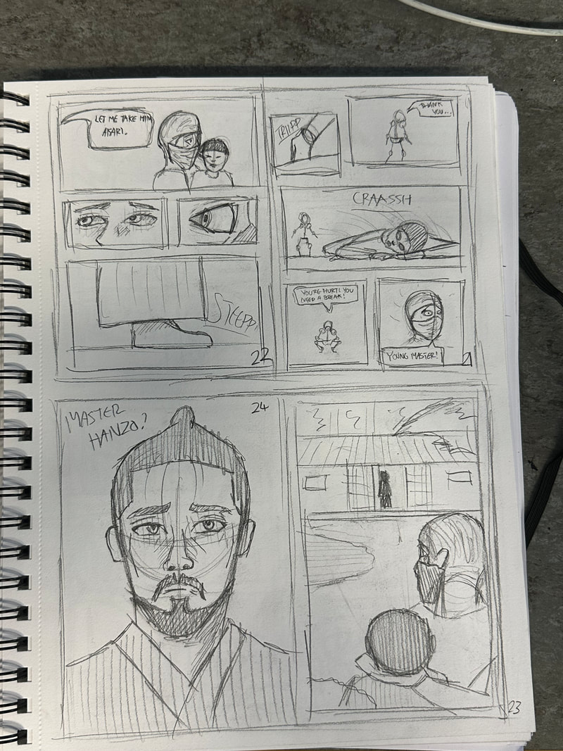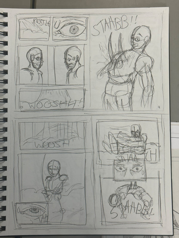 The page turned out better than I expected. I didn't include the mouth of each character as I thought the mask that each one was wearing was expressing the emotion I intended for them. I did my best to make believable action lines to show the movement and swiftness of the character. The onomatopoeia I kept in the fashion of following the action, though for the last panel it would've looked a bit awkward which is why I left that sound effect alone.
