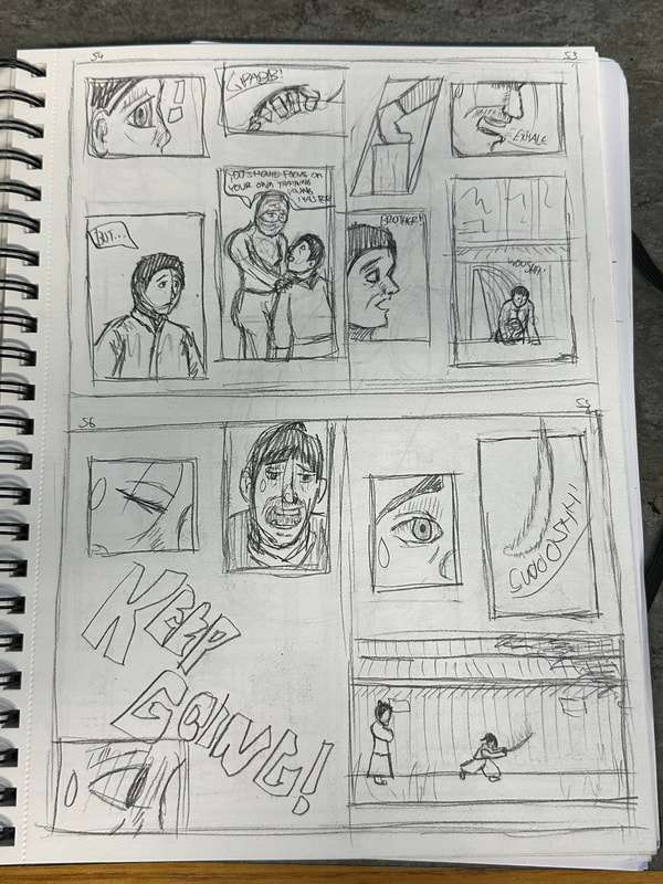 This page I wanted to imply that something is going to happen, so I decided to incorporate tightly packed panels with one overlapping two others to invoke that sense of importance. There wasn't many good poses of a back view of someone running so using a rough model I drafted up a pose to use.