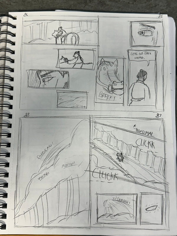 I have kept the page black to give the sense that it is nighttime. The use of the moon helps add to this sense as it is the only light source in the scenes and gives the viewer the opportunity to look closer to see what is happening. While the onomatopoeia is very rough I will go back into it once I make it more of a priority. The hatching around the bullet panel is also rough and not that great, but it can be something to work back on as I make more pages.